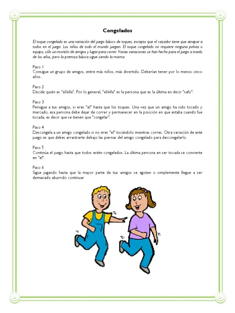El toque congelado es una variación del juego básico de toques, excepto que el cazador tiene que atrapar a todos en el juego. En el juego deben participar al menos 3 personas. Explícales como funciona el juego. Sí, así es, jugar es aprender, aunque muchas veces lo olvidamos.el juego no es sólo para que los niños/as se diviertan y pasen el tiempo con .